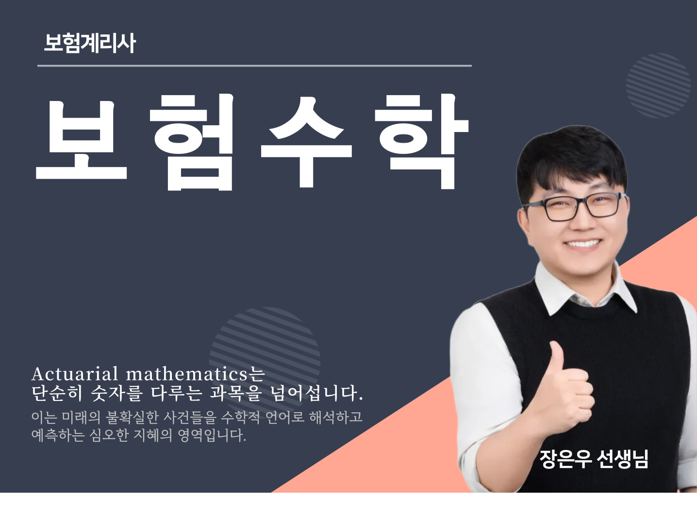 이 강의를 들으시고 보험수리학을 공부하신다면 1차 보험수학은 물론 보험수리학 2차 시험을 위한 단단한 기반을 다질 수 있을 것입니다.